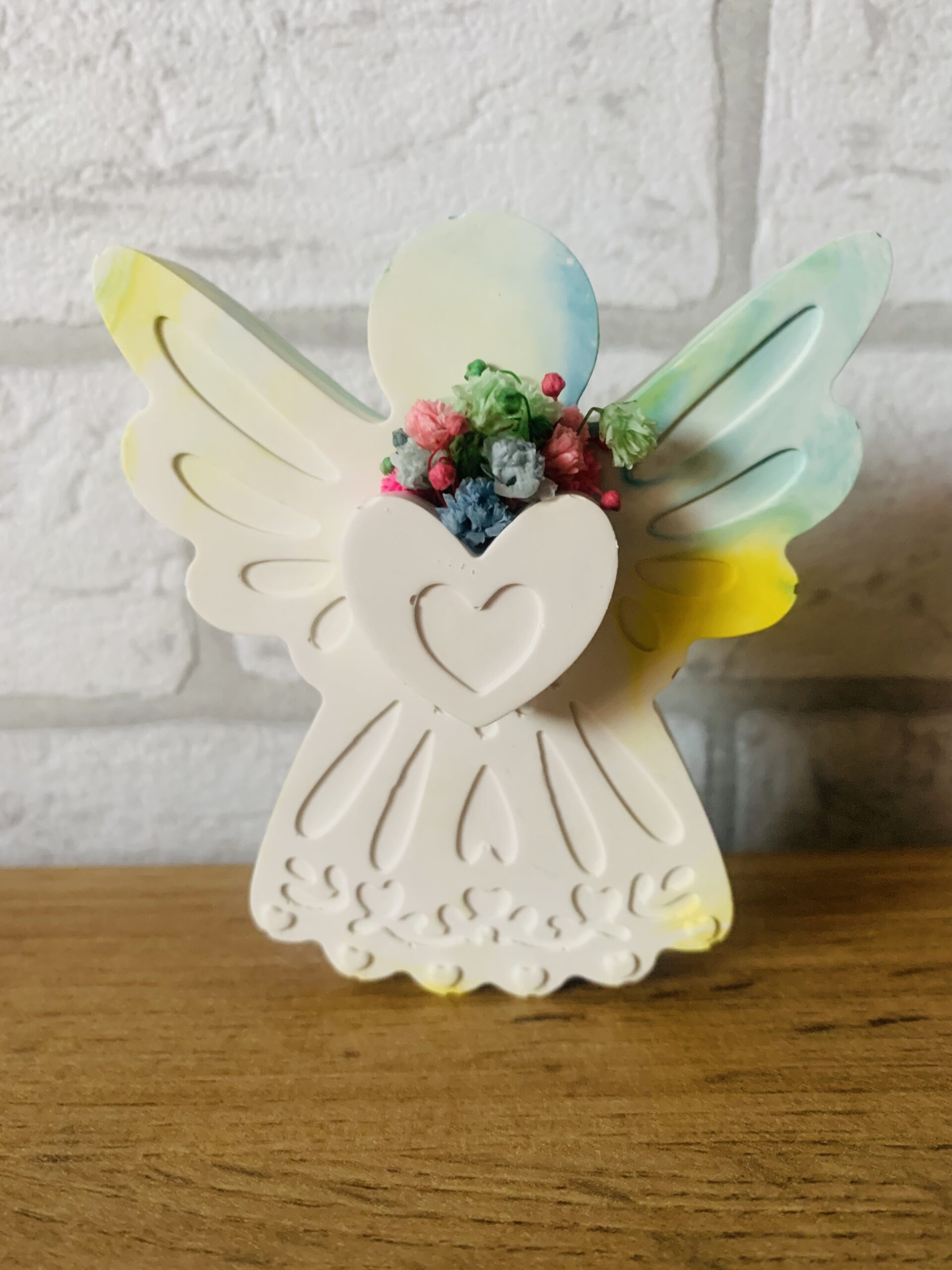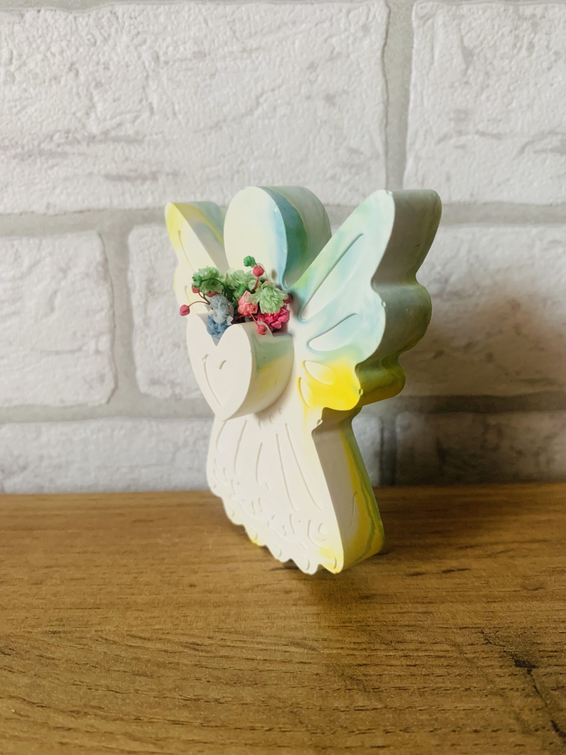 Każdy aniołek wykonywany jest ręcznie, z dbałością o detale. Stabilizowana gipsówka zachowuje swój naturalny urok i delikatność, dzięki czemu kompozycja prezentuje się lekko, romantycznie i bardzo subtelnie. To idealny wybór dla osób, które cenią minimalizm, symbolikę i naturalne akcenty.
