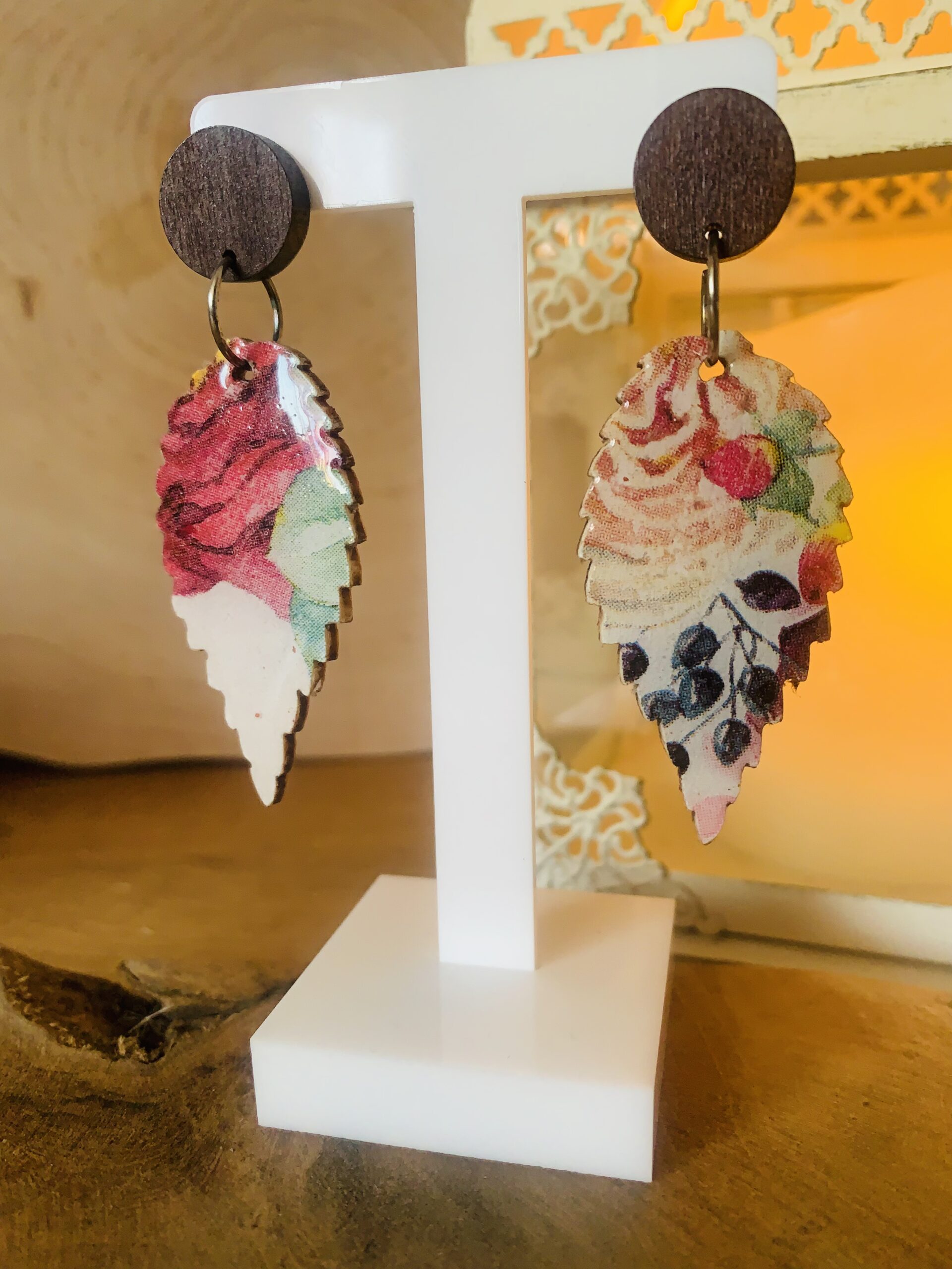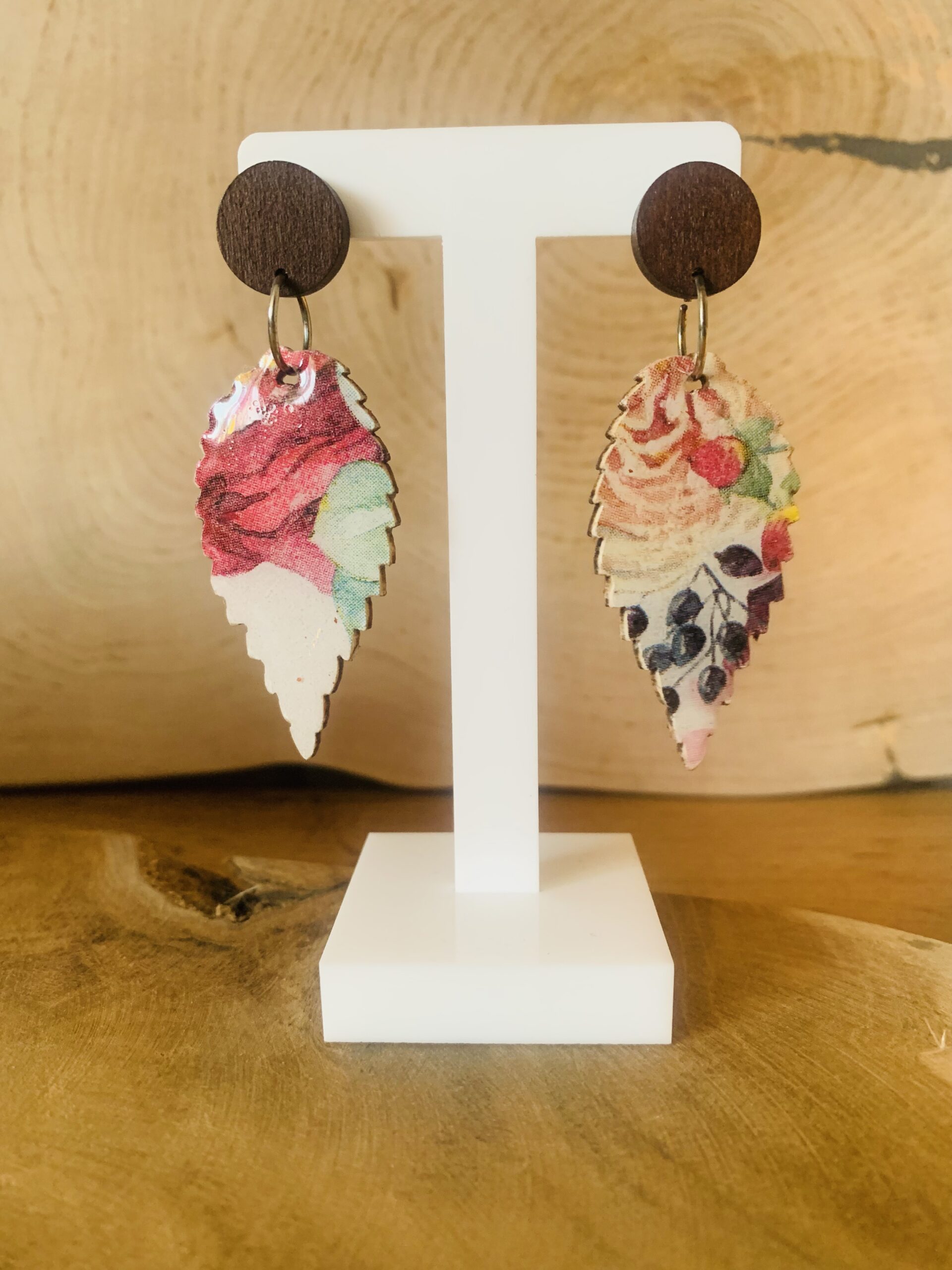 Te kolczyki z drewna i żywicy zostały wykonane ręcznie z dbałością o każdy detal. Naturalna drewniana baza w połączeniu z krystalicznie przejrzystą żywicą nadaje im lekkości i delikatnego połysku. Zapięcia ze stali chirurgicznej są trwałe, bezpieczne i wygodne w noszeniu przez cały dzień.