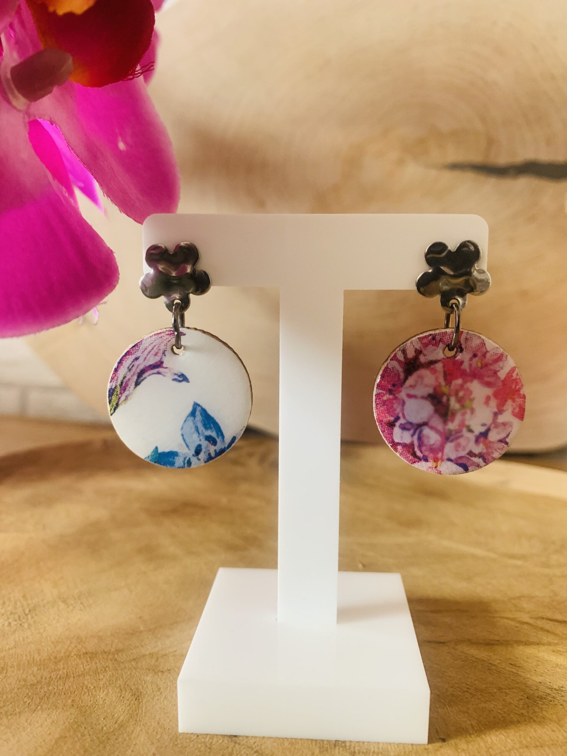 Połączenie drewna i żywicy nadaje kolczykom naturalny, artystyczny charakter oraz delikatny połysk. Każda para wykonywana jest ręcznie, dlatego stanowi unikatowy egzemplarz, który nie ma swojego odpowiednika.