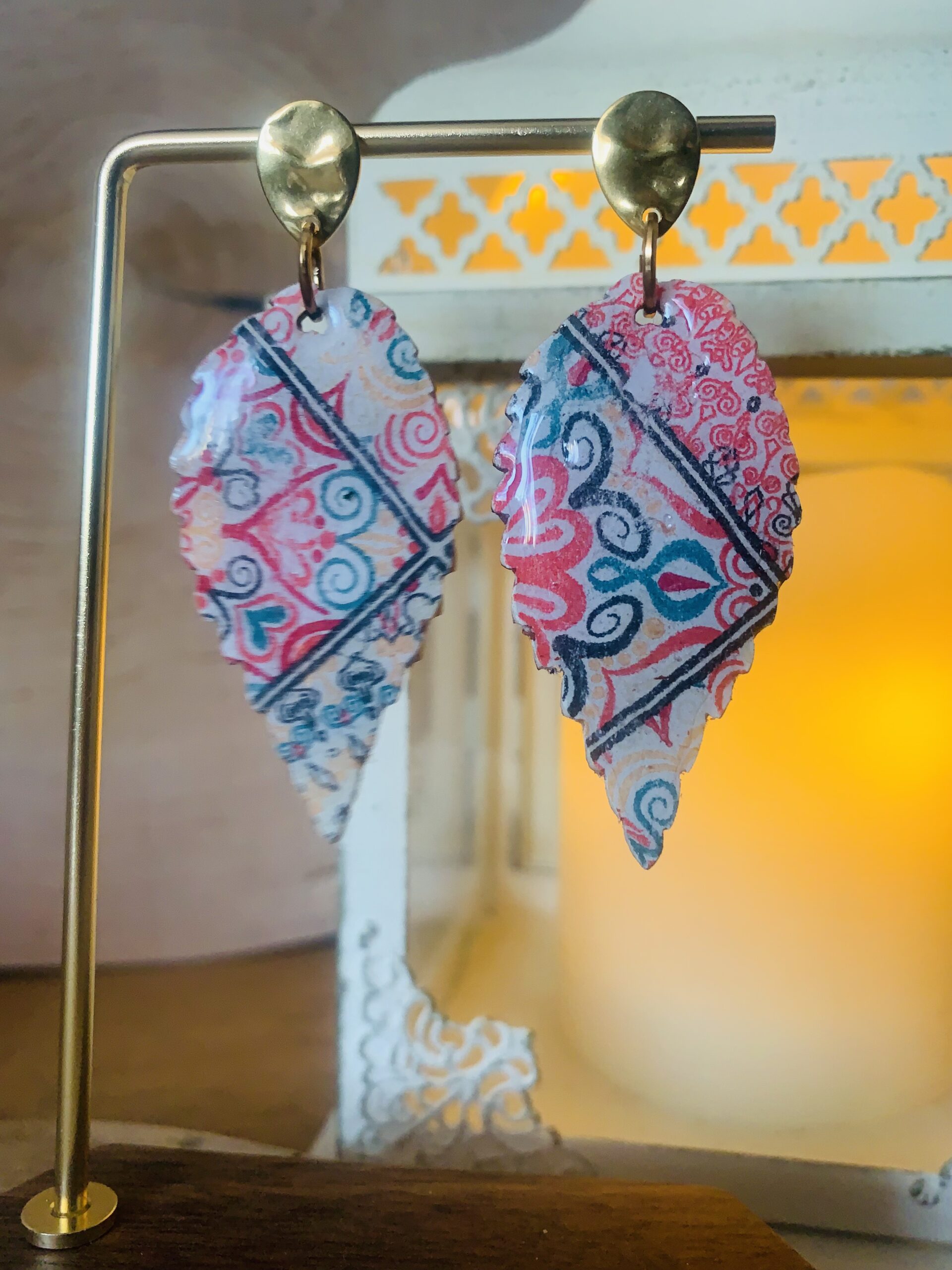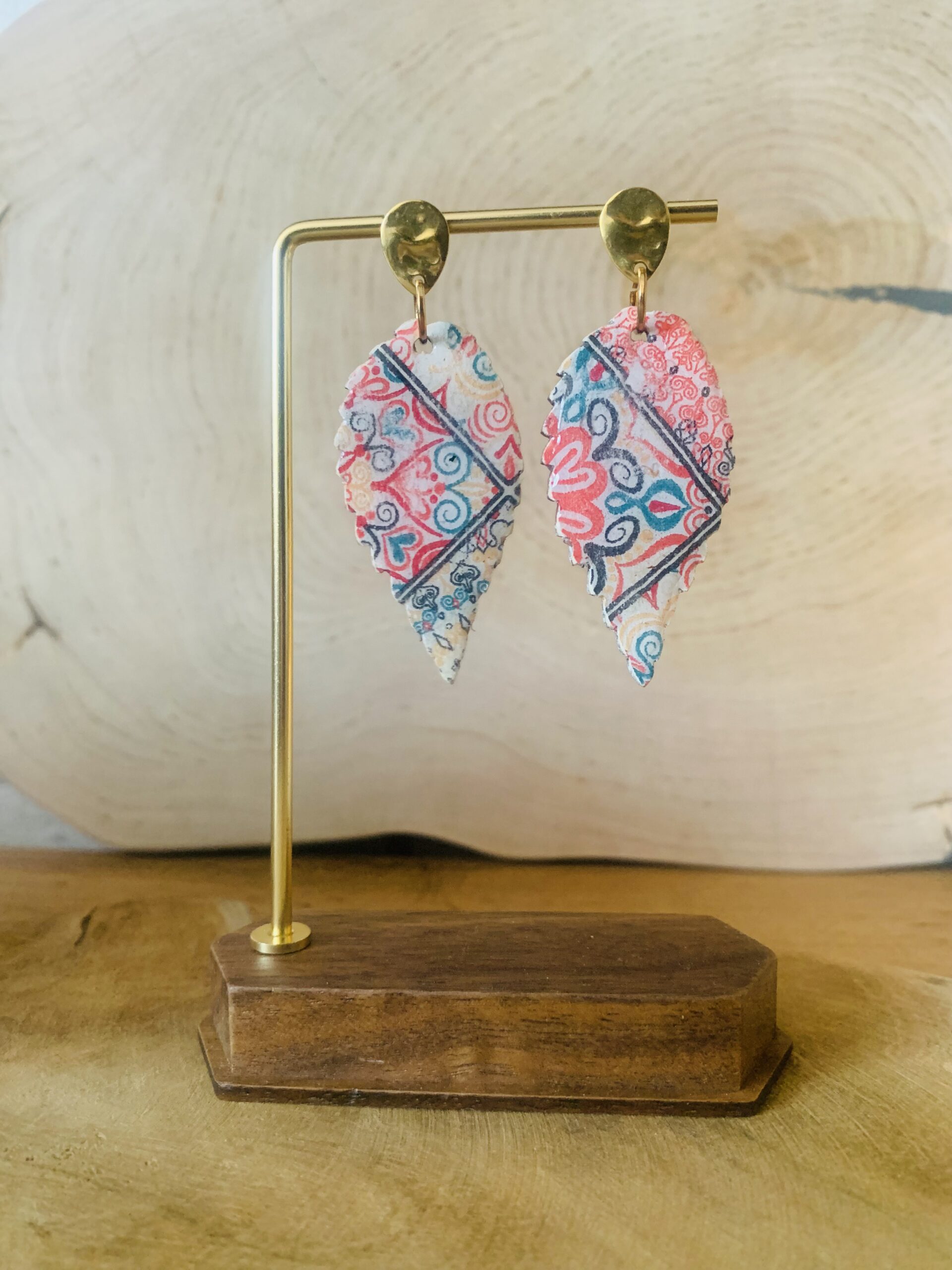Te kolczyki z drewna i żywicy zostały wykonane ręcznie z dbałością o detale. Lekka, drewniana baza zapewnia komfort noszenia nawet przez cały dzień, a wzór zamknięty w krystalicznie przejrzystej żywicy jest trwały i odporny na upływ czasu. Zapięcia ze stali chirurgicznej gwarantują wygodę i bezpieczeństwo.