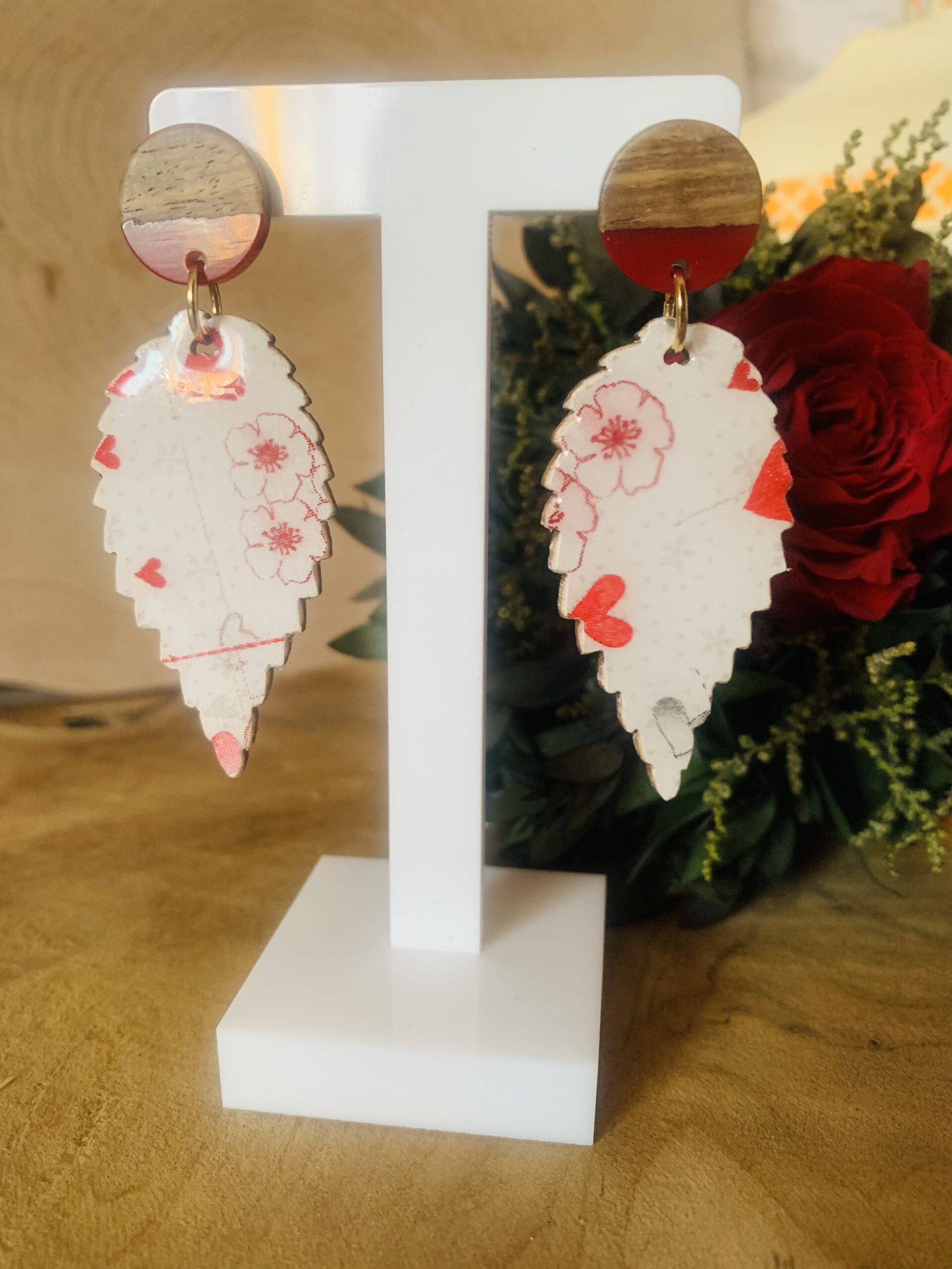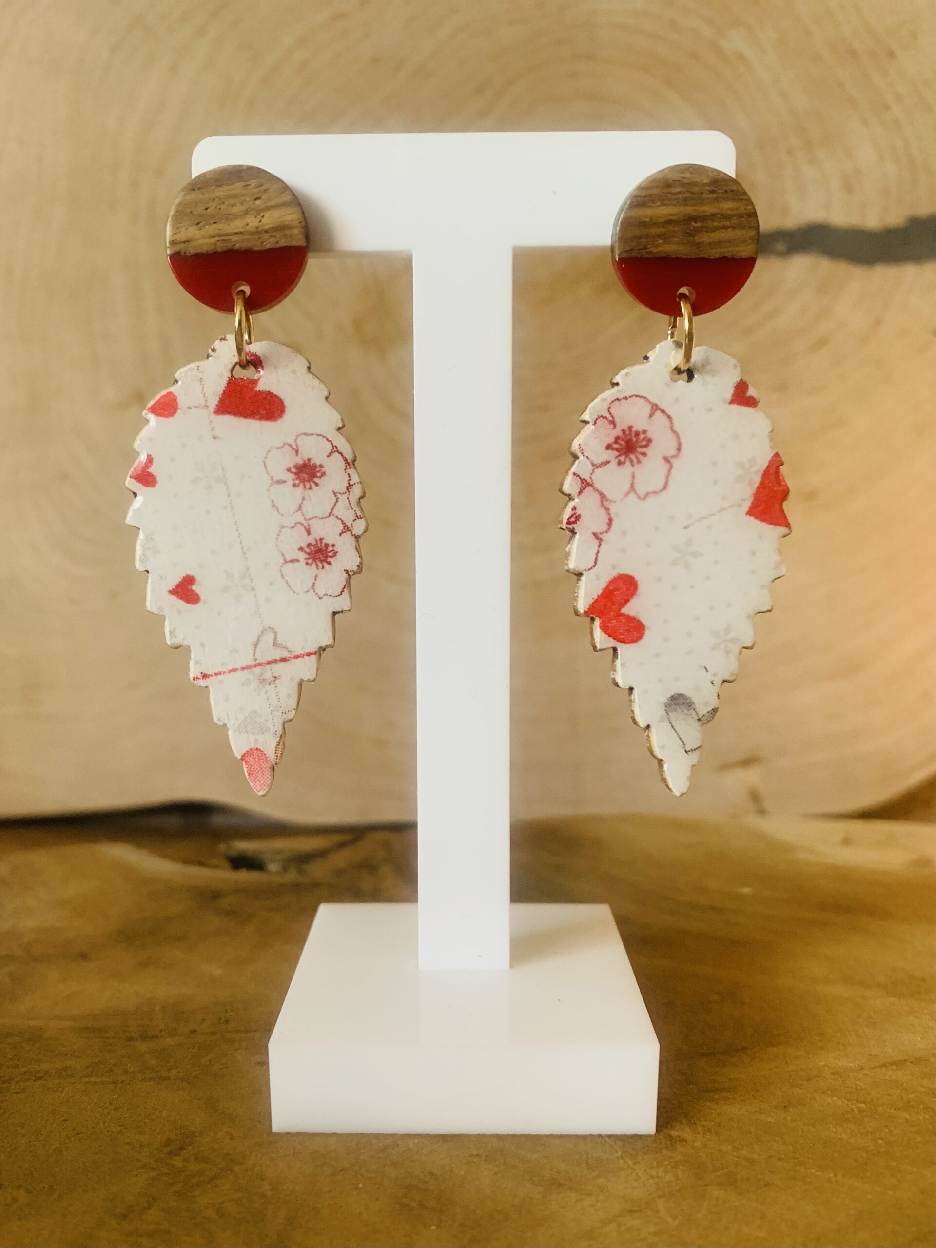 Te kolczyki z drewna i żywicy zostały wykonane ręcznie z dbałością o każdy detal. Drewniana baza połączona z trwałą, przezroczystą żywicą zapewnia komfort, lekkość i subtelny połysk. Zapięcia ze stali chirurgicznejgwarantują bezpieczeństwo i wygodę, nawet dla wrażliwej skóry.