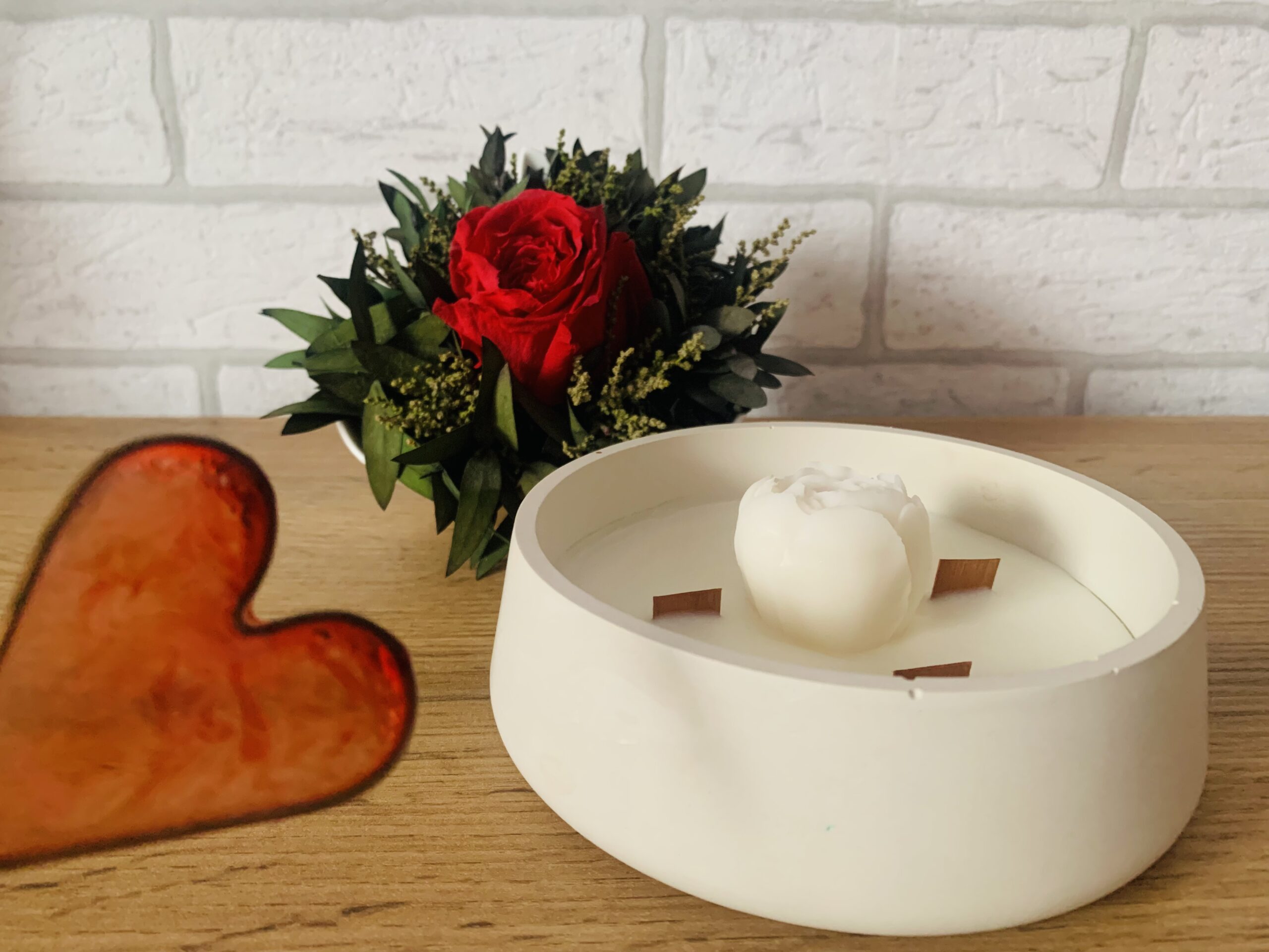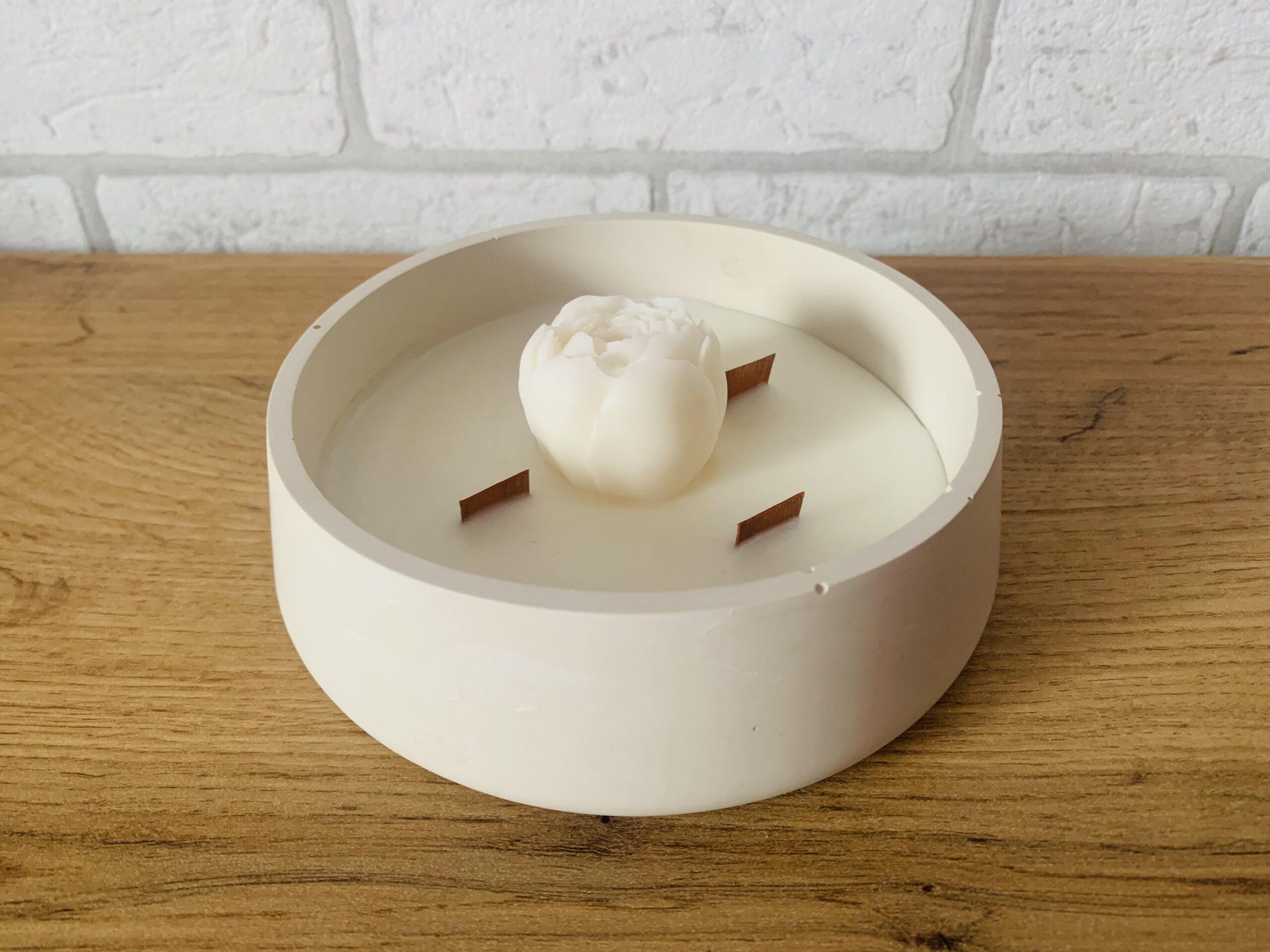 Świeca sojowa ręcznie tworzona, umieszczona w gipsowym naczyniu. Każdy egzemplarz powstaje od podstaw w mojej pracowni – dzięki temu jest unikatowy i dopracowany w najmniejszym detalu.