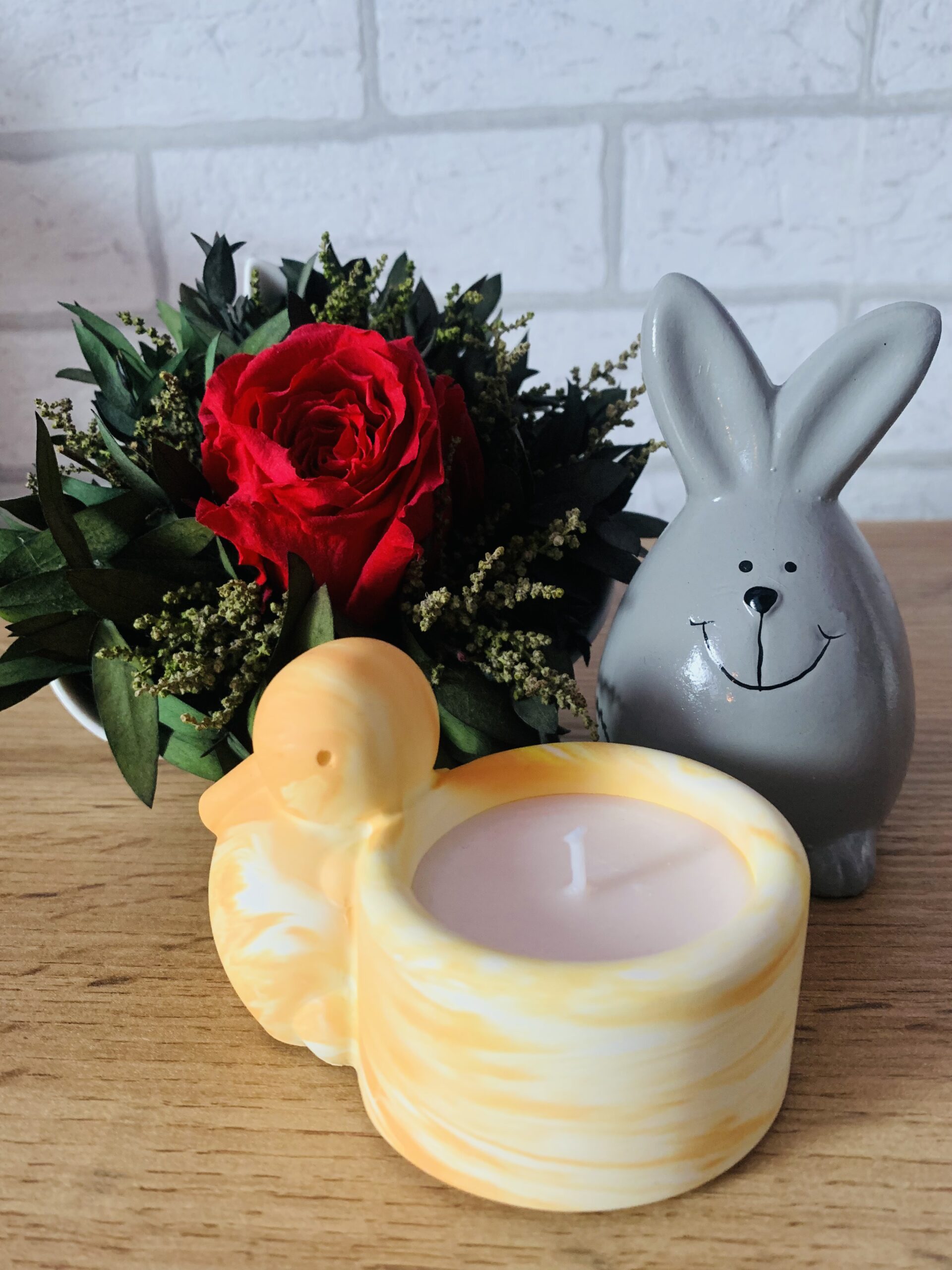 Zajączek ze światełkiem to urocza świeca sojowa umieszczona w ręcznie wykonanym gipsowym naczyniu w kształcie zajączka trzymającego świeczkę w swoich łapkach. To połączenie subtelnej dekoracji i naturalnego światła, które wprowadza do wnętrza ciepło, delikatność i odrobinę bajkowego klimatu.