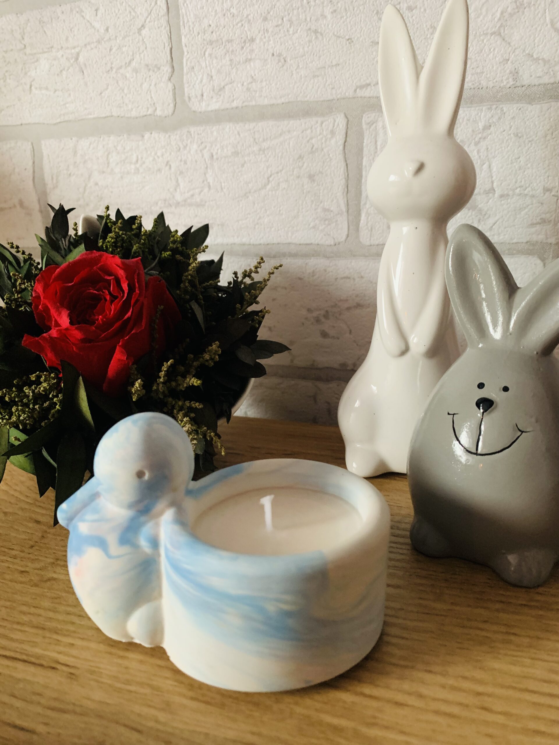 Zajączek ze światełkiem to urocza świeca sojowa umieszczona w ręcznie wykonanym gipsowym naczyniu w kształcie zajączka trzymającego świeczkę w swoich łapkach. To połączenie subtelnej dekoracji i naturalnego światła, które wprowadza do wnętrza ciepło, delikatność i odrobinę bajkowego klimatu.
